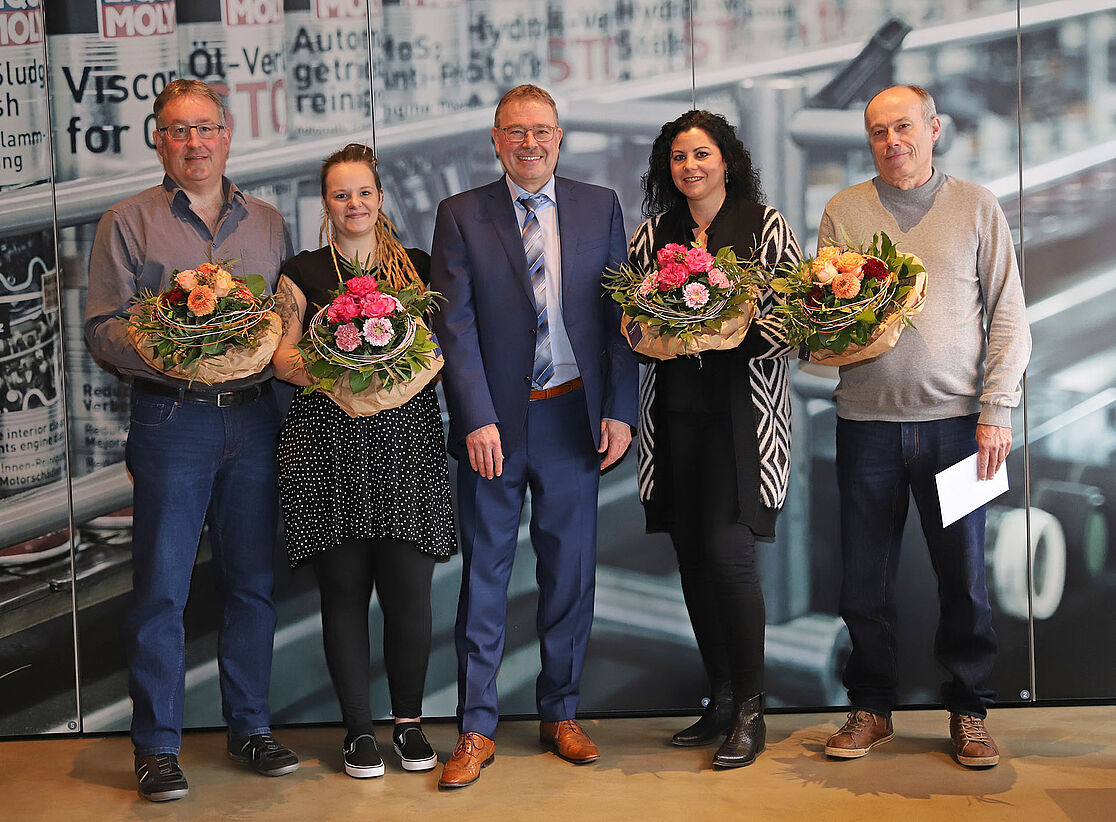 Im Namen aller Kolleginnen und Kollegen bedankte sich unser Geschäftsführer Günter Hiermaier (mitte) bei allen Jubilaren für ihr langjähriges Engagement. Wir gratulieren von Herzen und freuen uns auf viele weitere gemeinsame Jahre in der LIQUI MOLY-Familie.