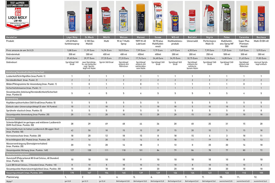Auf den Plätzen zwei und drei folgen in der Ergebnistabelle die ebenfalls mit „gut“ bewerteten Produkte S 100 Das Multiöl von Dr. Wack und das von Würth. Das S 100, ebenfalls ein Allrounder-Produkt, punktet mit guten Ergebnissen beim Verschleiß- und Korrosionsschutz, bei Schmierwirkung und der Wasserverdrängung sowie makelloser Materialverträglichkeit. Auch das Multiöl von Würth lässt bei der Schmierfähigkeit keine Wünsche offen, schwächelt jedoch beim Verschleiß- und Rostschutz.