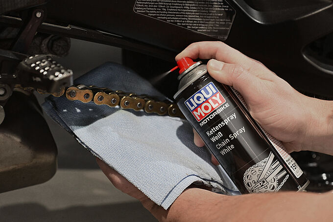 Im Zuge der Auswinterung sollte auch die Kette Ihres Zweirads geprüft und gereinigt werden. Entstandene Verschmutzungen und Ablagerungen zwischen den Kettengliedern verkrusten über den Winter stark. Die darin enthaltenen Sand- und Schmutzpartikel reiben die O-Ringe ab. Das führ wiederum zu einer erhöhten Reibung der einzelnen Bauteile und fördert den Verschleiß stark. Schnelle Abhilfe schafft unser Motorbike Ketten- und Bremsreiniger. Verkrustungen und sonstige Verschmutzungen werden nach dem Aufsprühen rückstandsfrei entfernt. Um anschließend eine optimale Schmierung und guten Spritzwasserschutz während der Fahrt zu gewährleisten sollte das Motorbike Kettenspray oder das Motorbike Kettenspray Race aufgetragen werden.
