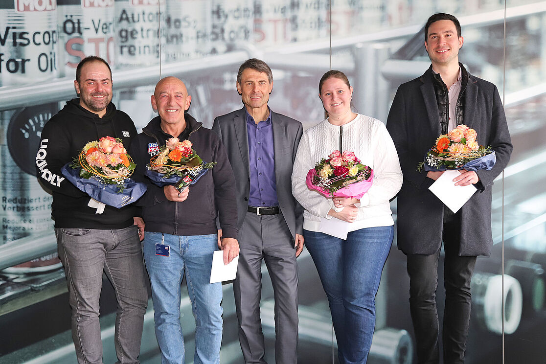 Im Januar feierten vier LIQUI MOLY-Familienmitglieder Firmenjubiläum. Geschäftsführer Dr. Uli Weller gratulierte im Namen aller Mitunternehmerinnen sowie Mitunternehmer und bedankte sich mit warmen Worten und blühenden Sträußen für das langjährige Engagement. Auf viele weitere Jahre!