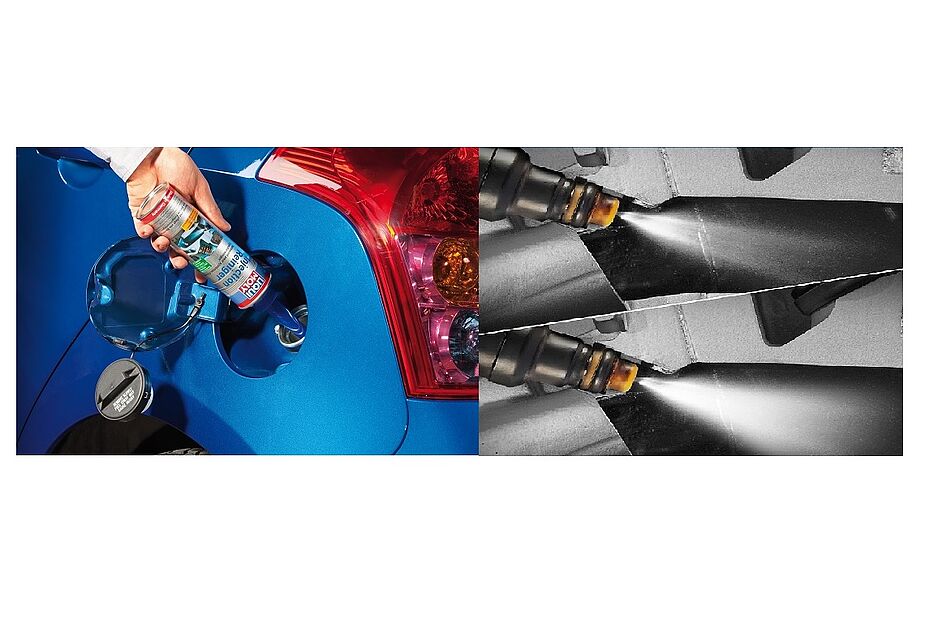 Der Injection-Reiniger von LIQUI MOLY beseitigt klebrige, harzartige Ablagerungen in der Einspritzanlage und ist spielend einfach anzuwenden. Die Wirkstoffe des Injecton-Reinigers befreien Injektoren, Einlassventile und Zündkerzen vom Schmutz. Die Kraftstoffausbeute wird verbessert, weil das Additiv die Kraftstoffvernebelung optimiert. Das Foto zeigt oben das Sprühbild eines Injektors vor der Reinigung, unten nach der Anwendung des Injection-Reinigers.