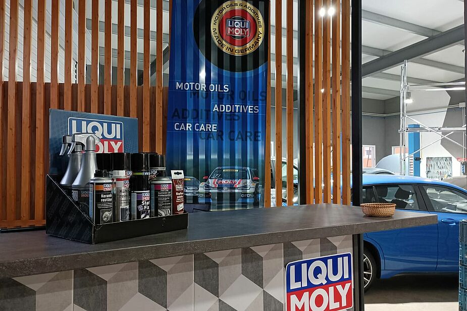 Para subrayar esta asociación, los locales del taller han sido decorados con un expositor exclusivo y banderolas LIQUI MOLY, en una iniciativa llevada a cabo en colaboración con nuestro equipo comercial. Este complemento no sólo enriquece visualmente el espacio, sino que también subraya el compromiso de Llorca Automoción con la excelencia y la calidad que representa la marca LIQUI MOLY.