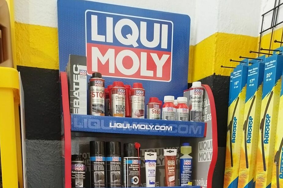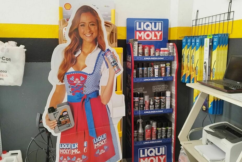 En este contexto, nuestro equipo colaboró en la implantación de un expositor LIQUI MOLY y en la introducción de una de nuestras Deco Girls para decorar la tienda.