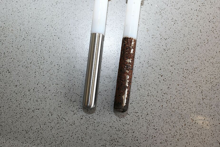 Quelles sont les causes de la corrosion ? Elle est due à l’eau présente dans le carburant. La corrosion peut soit être liée à l’eau de condensation, qui retombe sur les parois intérieures du réservoir, soit à du carburant contaminé ou à une distraction lors du plein. Des tests effectués en laboratoire permettent de démontrer la vitesse à laquelle la rouille peut se propager. Une tige métallique est plongée dans un verre d’échantillon de carburant auquel 10 pour cent d’eau sont ajoutés. Ce verre est ensuite placé dans un four à une température de 60 degrés. Après 24 heures seulement, la tige métallique est déjà recouverte de rouille.