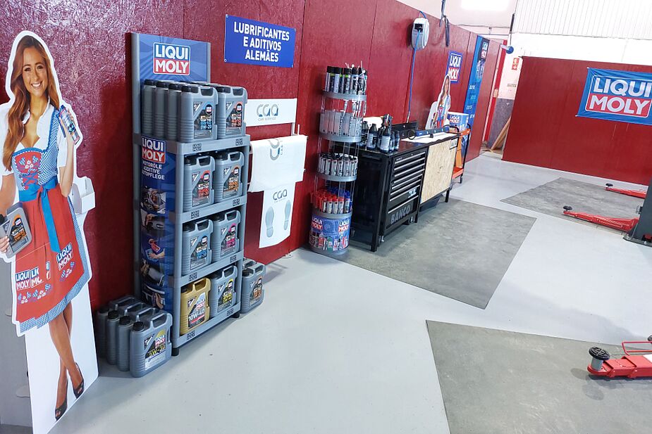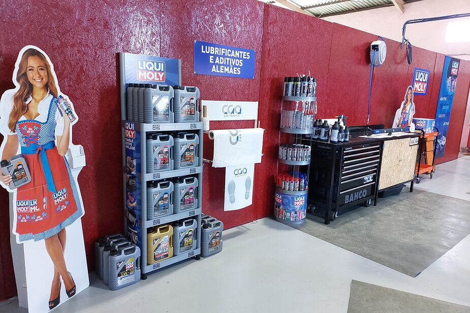 Além das soluções LIQUI MOLY espalhadas pela oficina e ao dispor dos seus clientes, a recepção conta com diversos elementos decorativos alusivos à marca premium alemã que comunicam diretamente com os visitantes.